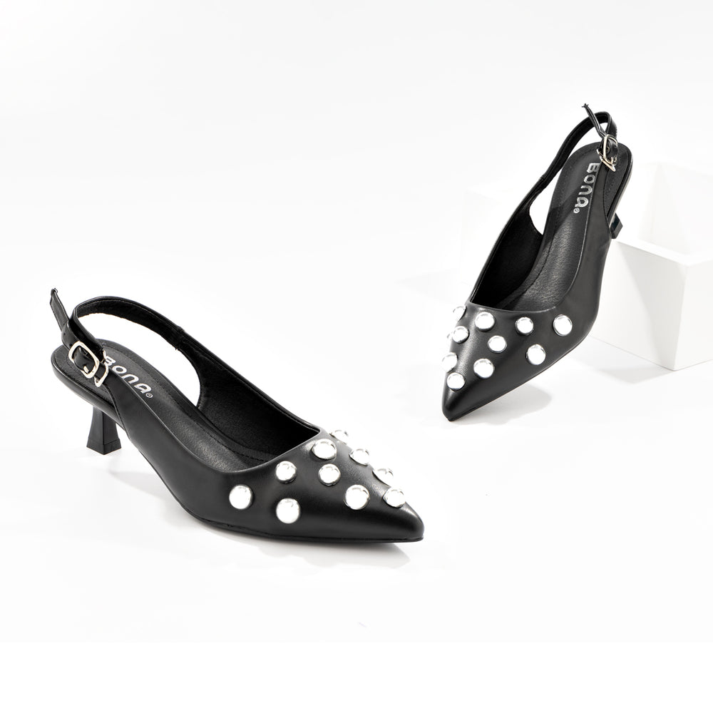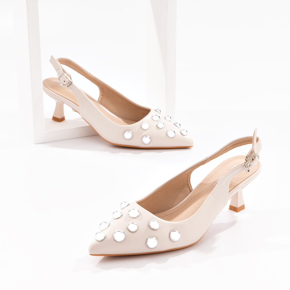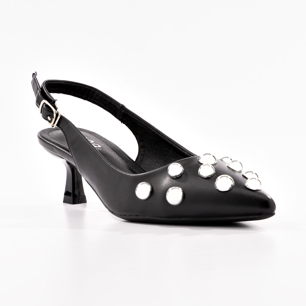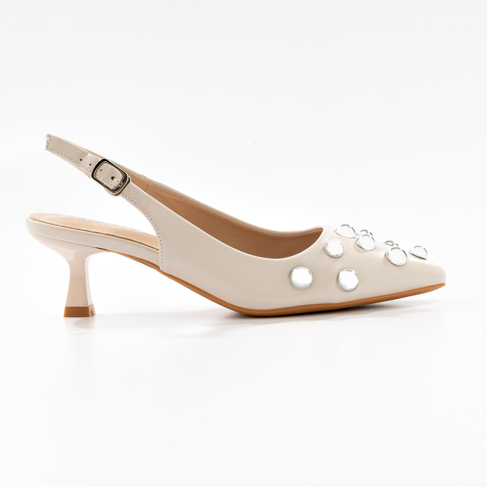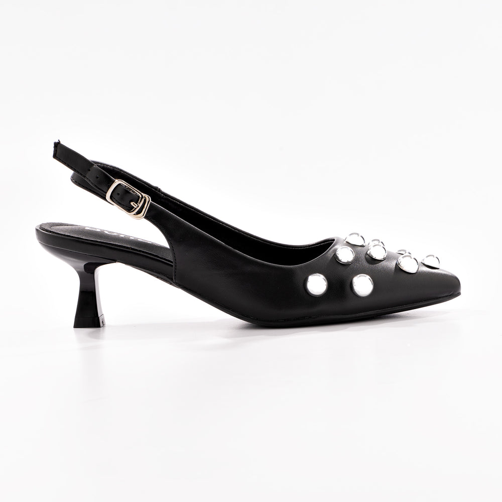 Tacon de moda para mujer, elegante en colores con acabado satinado. Destaca por sus delicadas aplicaciones de perlas blancas en el empeine que aportan un toque romántico y sofisticado. Su tacón bajo tipo kitten proporciona comodidad y elegancia, mientras que la puntera afilada estiliza la figura. Cuenta con correa ajustable en el talón con hebilla dorada para un calce perfecto.