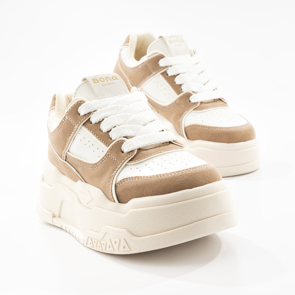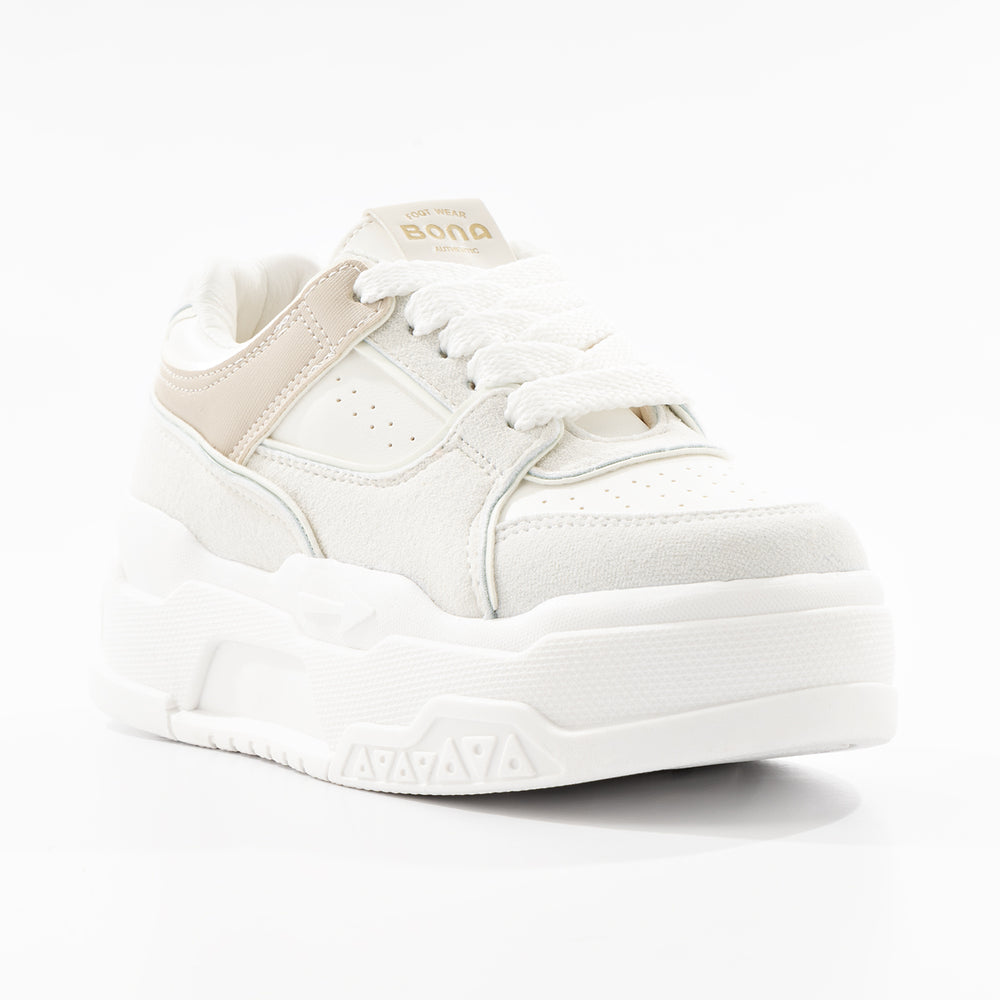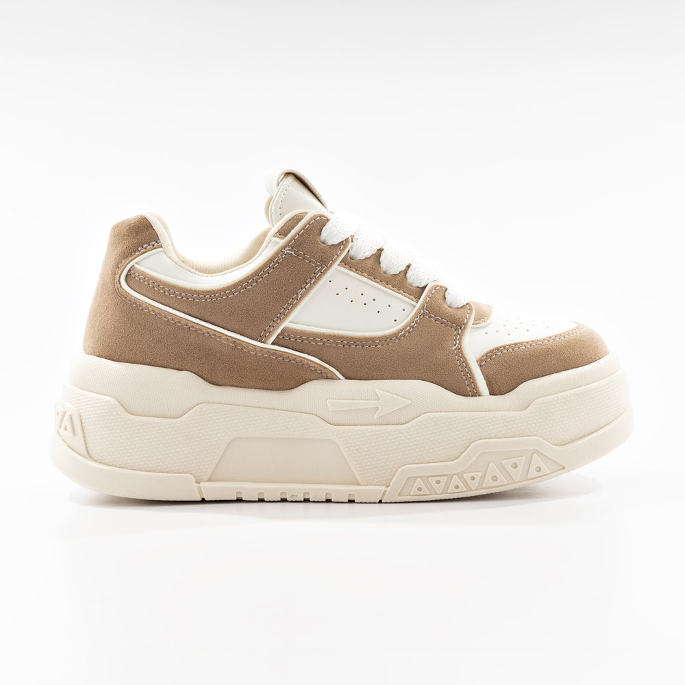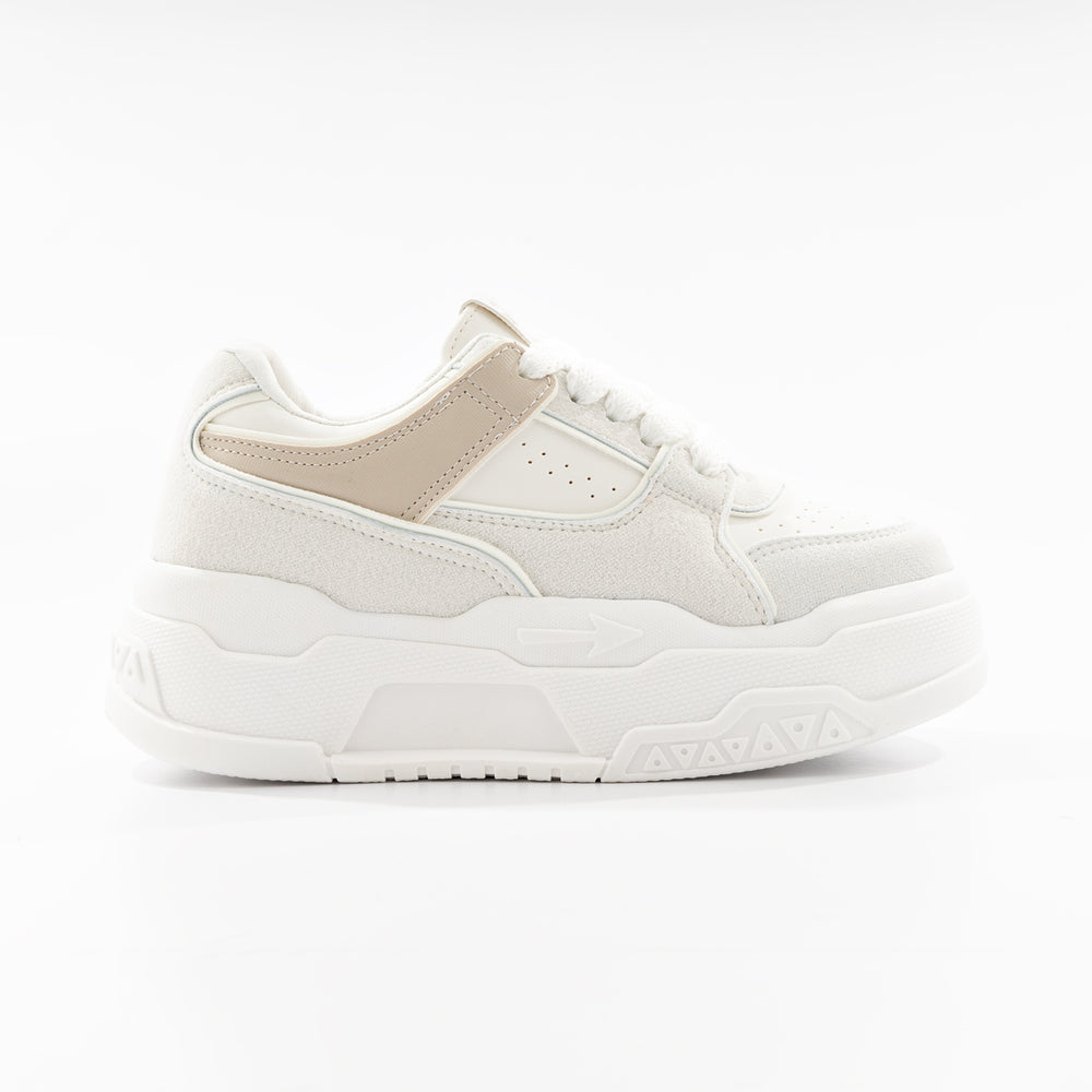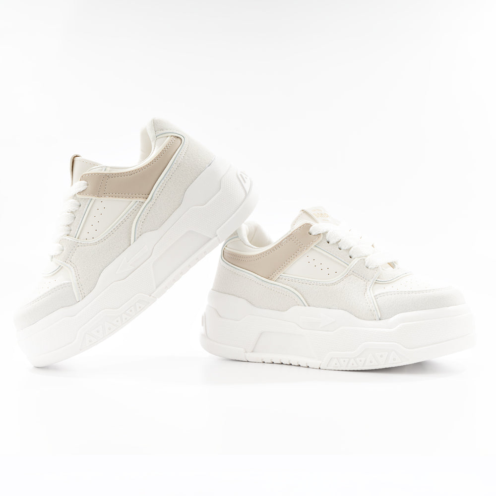 Tenis de moda para mujer, con plataforma alta. Diseño moderno en color blanco con detalles en taupe. Perfectos para un look casual y cómodo con estilo urbano. Suela gruesa tipo plataforma que brinda altura y comodidad durante todo el día.