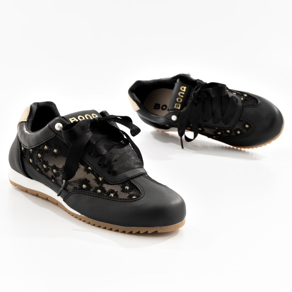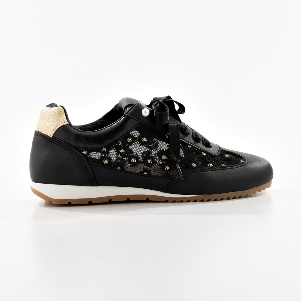 Tenis de moda para mujer, combinan comodidad y estilo con detalles sofisticados. Elaborados en cuero sintético de alta calidad con acabado suave. Decorados con aplicaciones de pedrería brillante que aportan un toque glamuroso. Incluyen listones de satín para un cierre ajustable y femenino. Suela de goma antideslizante con diseño texturizado para mayor tracción. Plantilla acolchada que brinda confort durante todo el día.