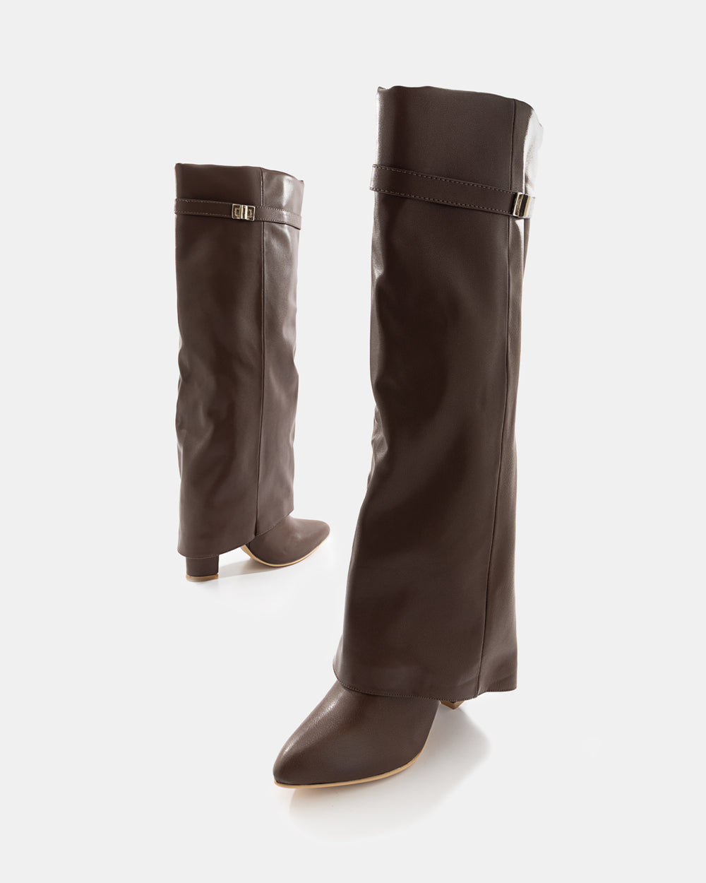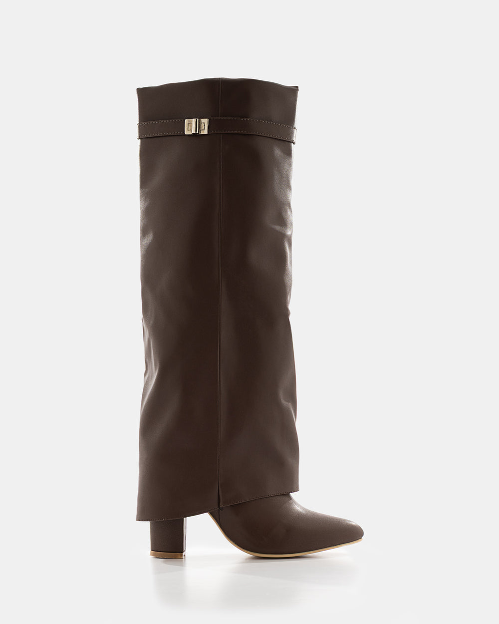 Botas de moda para mujer, con un diseño vanguardista, con una silueta completamente estructurada y de inspiración futurista o conceptual. Están fabricadas en un material tipo cuero sintético mate, que les aporta un acabado elegante y sobrio.